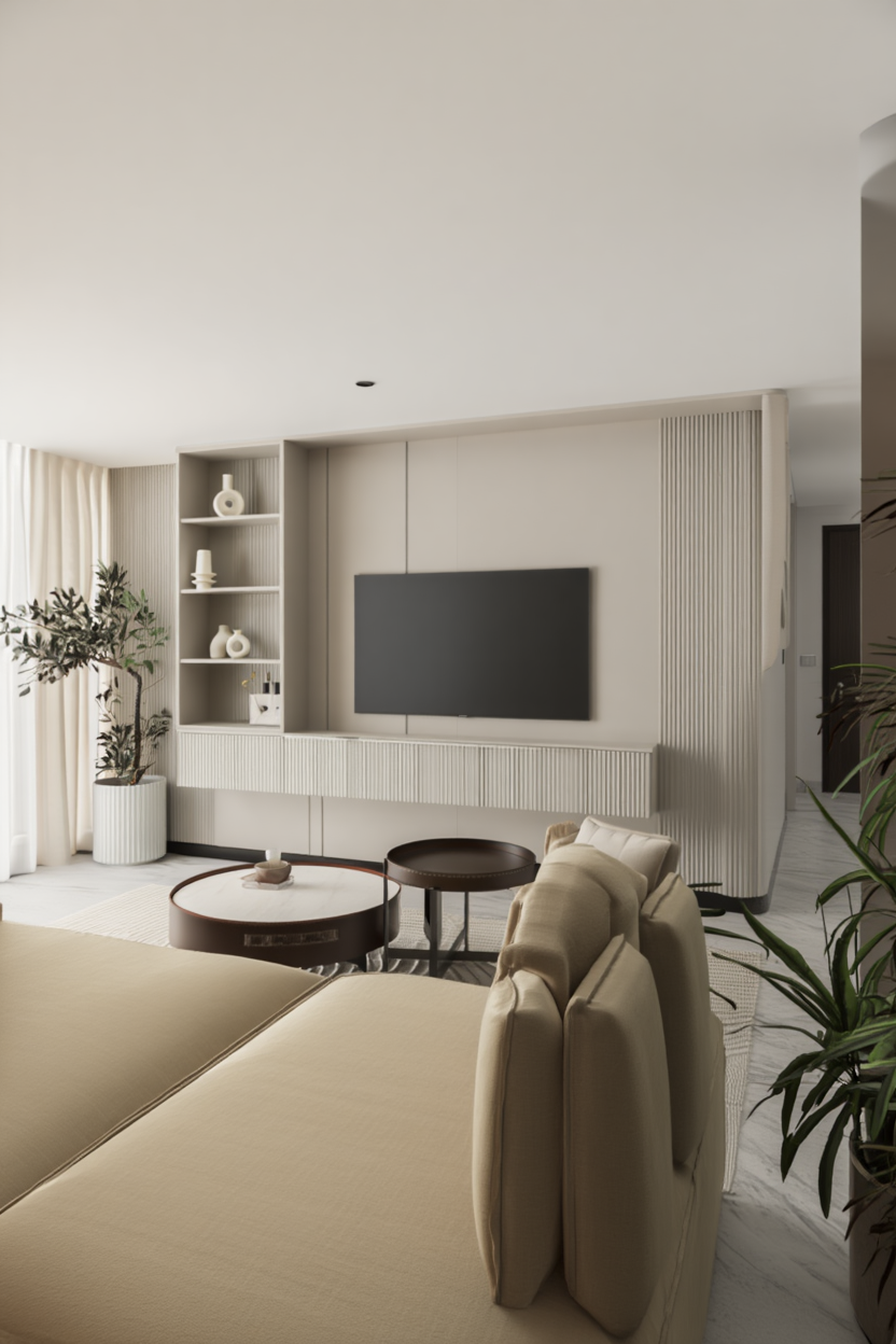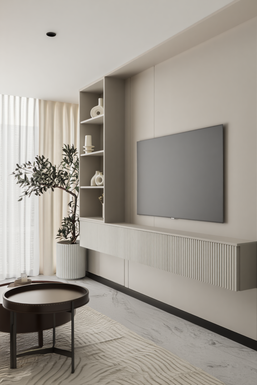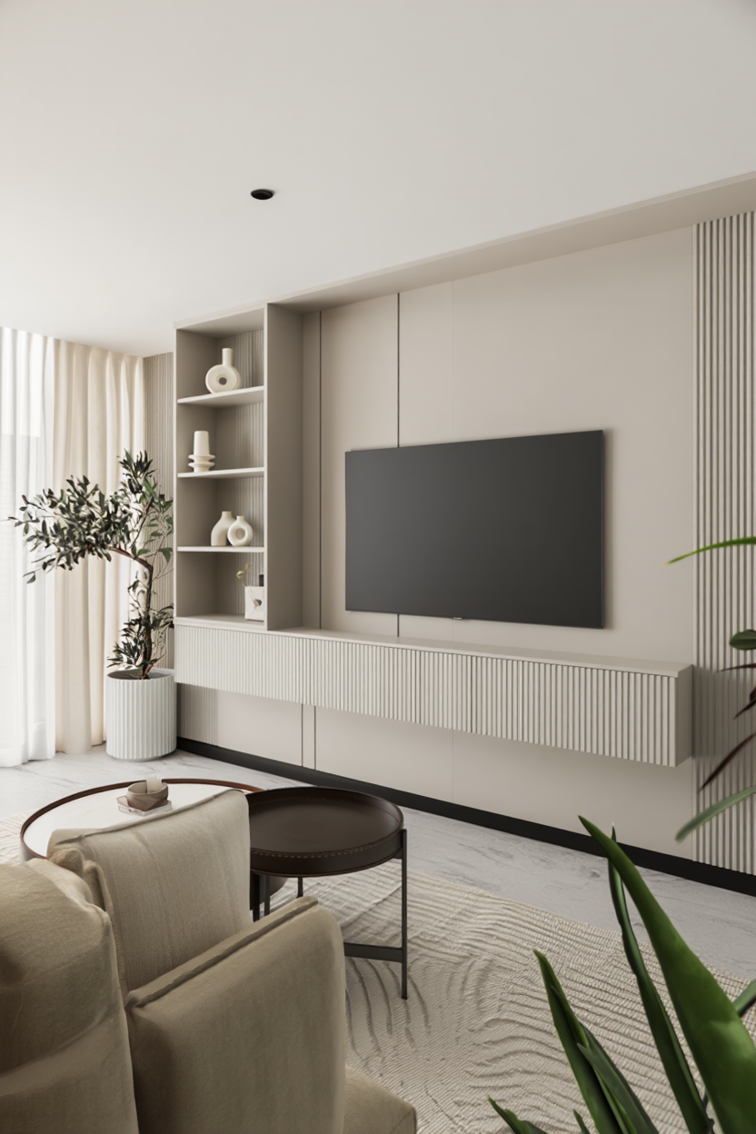חיפוי קיר טלוויזיה דגם פשתן חול – כולל מערכת אחסון בהתאמה אישית