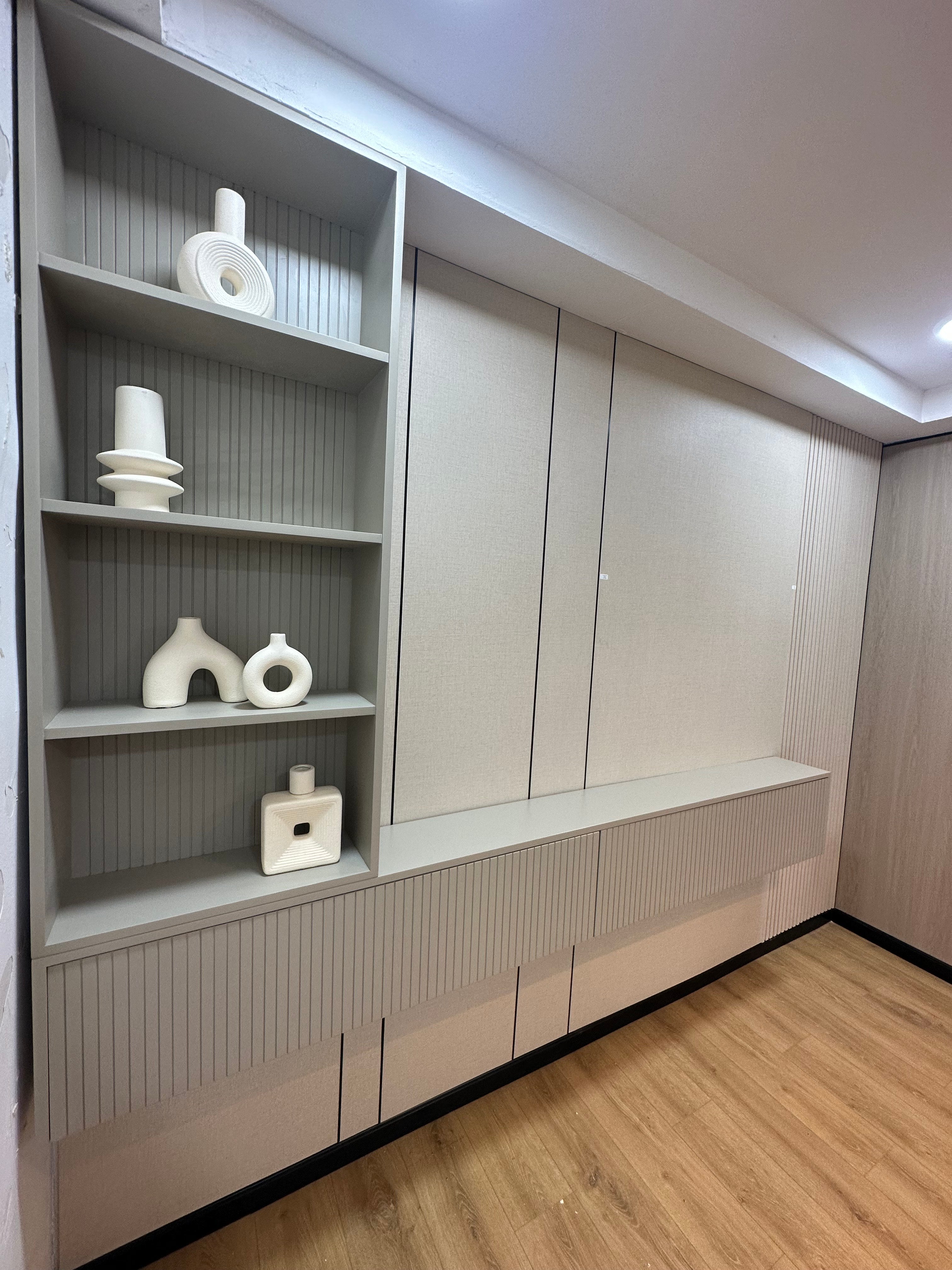 • חיפוי קיר טלוויזיה פישתן חול ומערכת אחסון בהתאמה אישית צבע בתנור